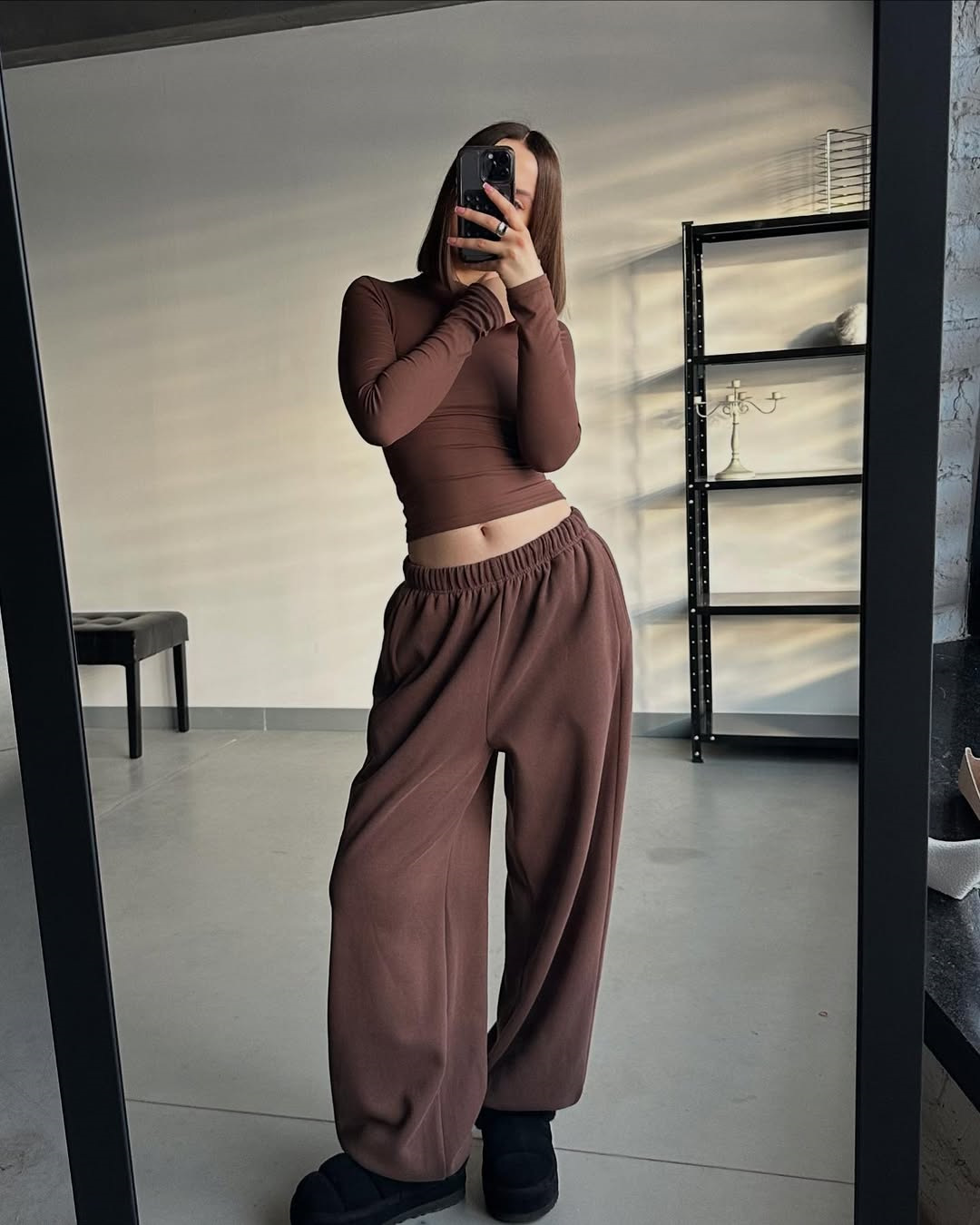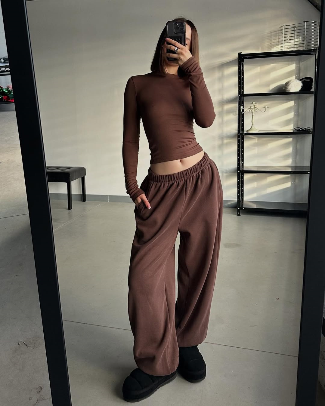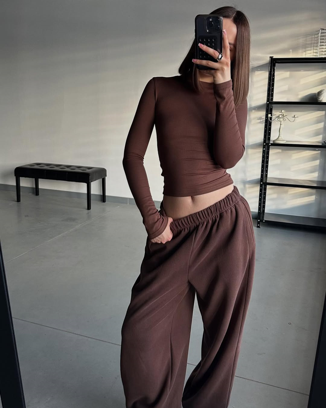 Women's Solid Color Round Neck Slim Fit Long Sleeve T-shirt High Waist Loose Sweatpants Set